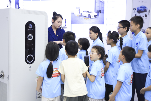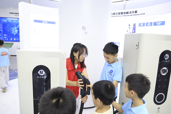 宣傳片觀看結(jié)束后,孩子們最期待的展廳探秘環(huán)節(jié)正式開始。在講解員和志愿者的帶領(lǐng)下,孩子們步入了展廳,沉浸式感受科技的魅力。講解員用生動(dòng)易懂的語言,結(jié)合香港大學(xué)志愿者們的實(shí)物操作演示,將復(fù)雜的鋰電池檢測技術(shù)、新能源汽車充電技術(shù)講述得妙趣橫生、直白易懂。孩子們興致勃勃,認(rèn)真聆聽講解。